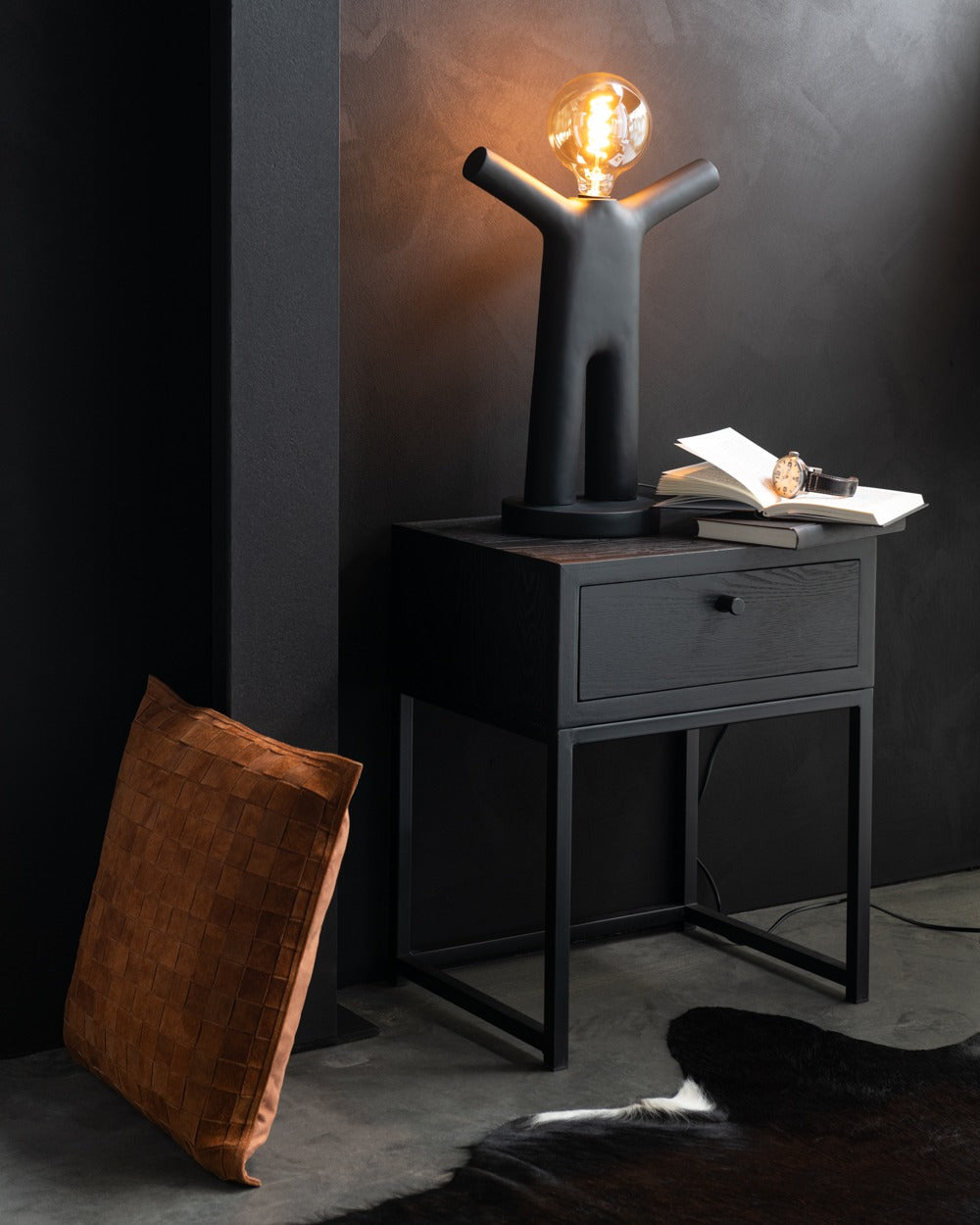 "Durf een of meerdere muren mat zwart te verven. Met kussens in koperkleur, donker glas, hout en kaarsen creëer je geborgenheid in je zithoek."